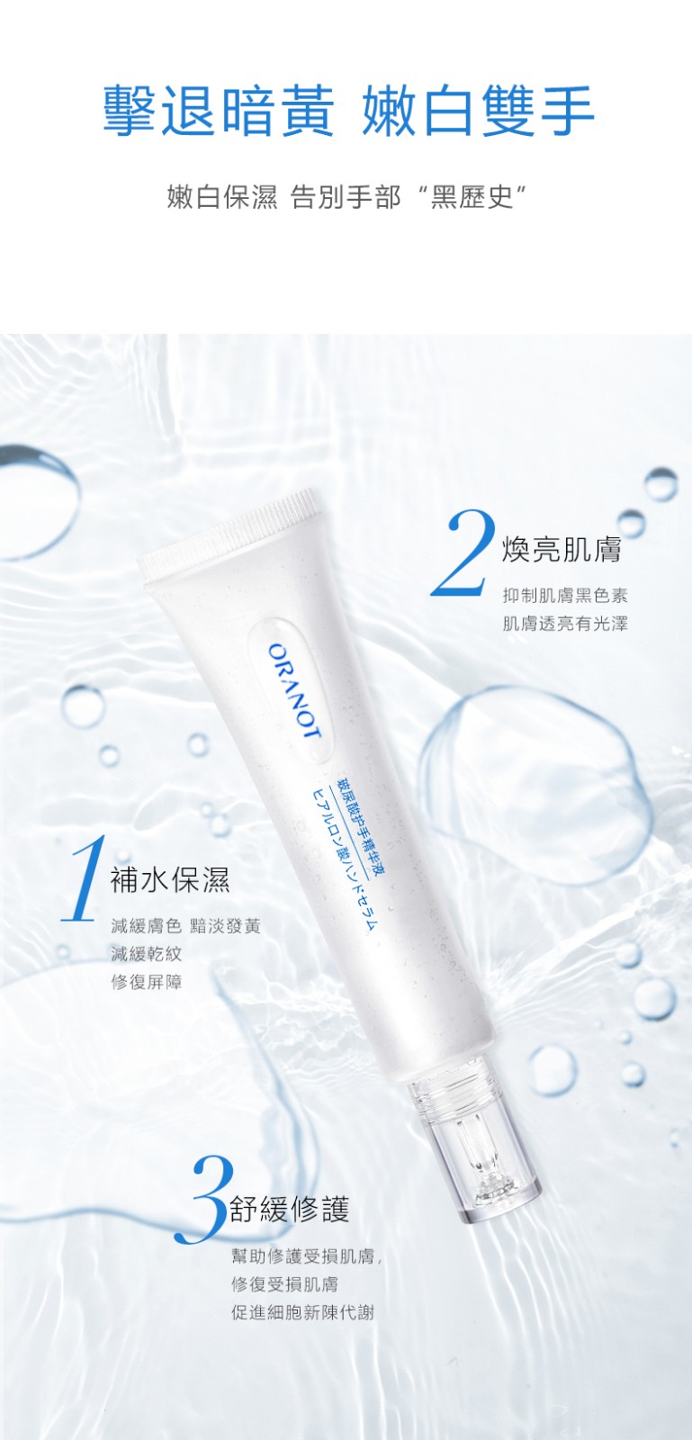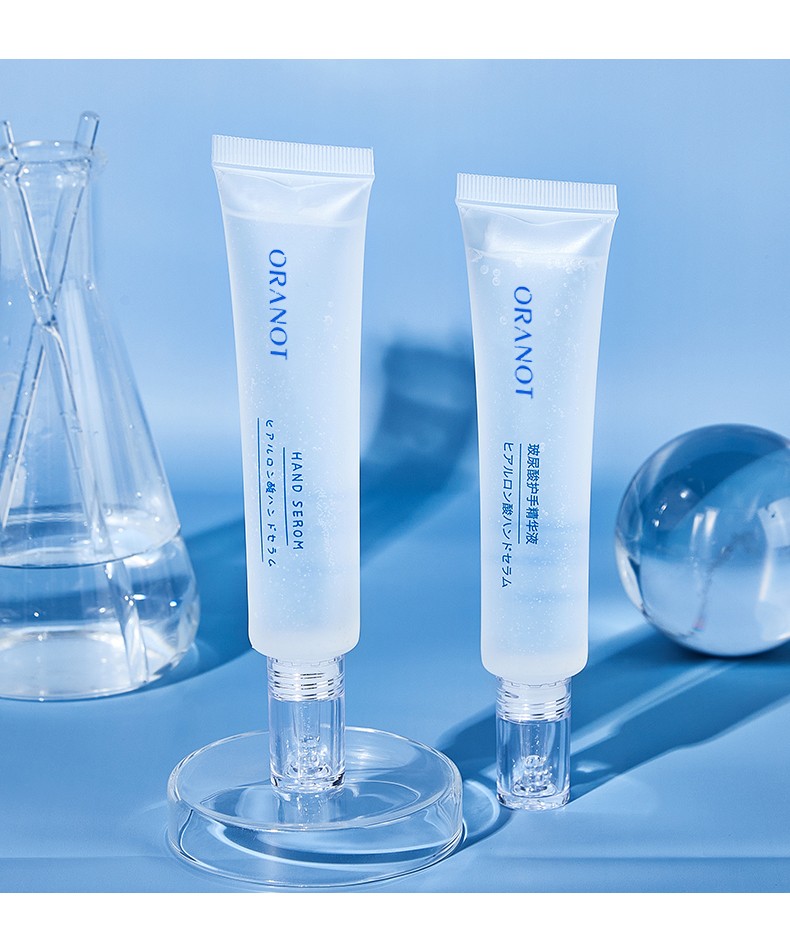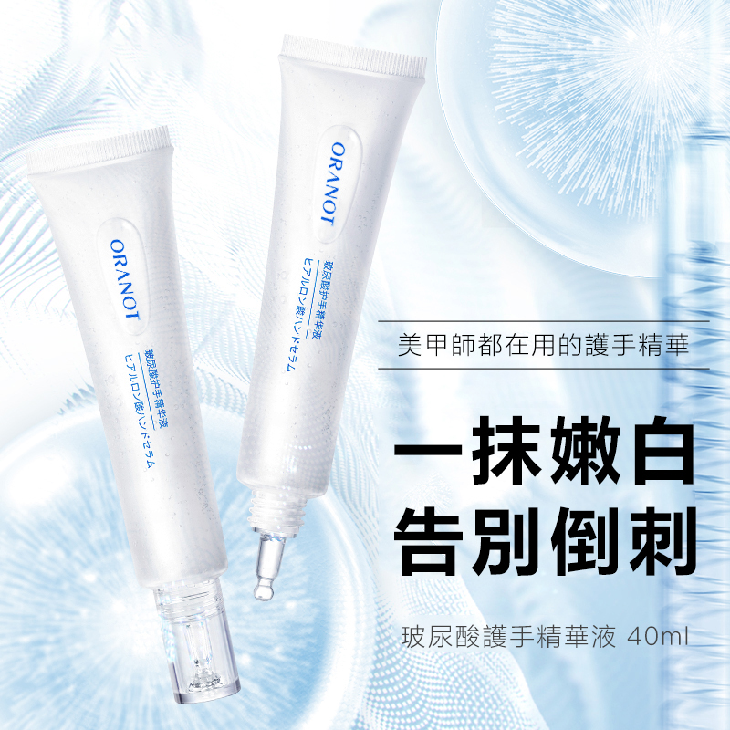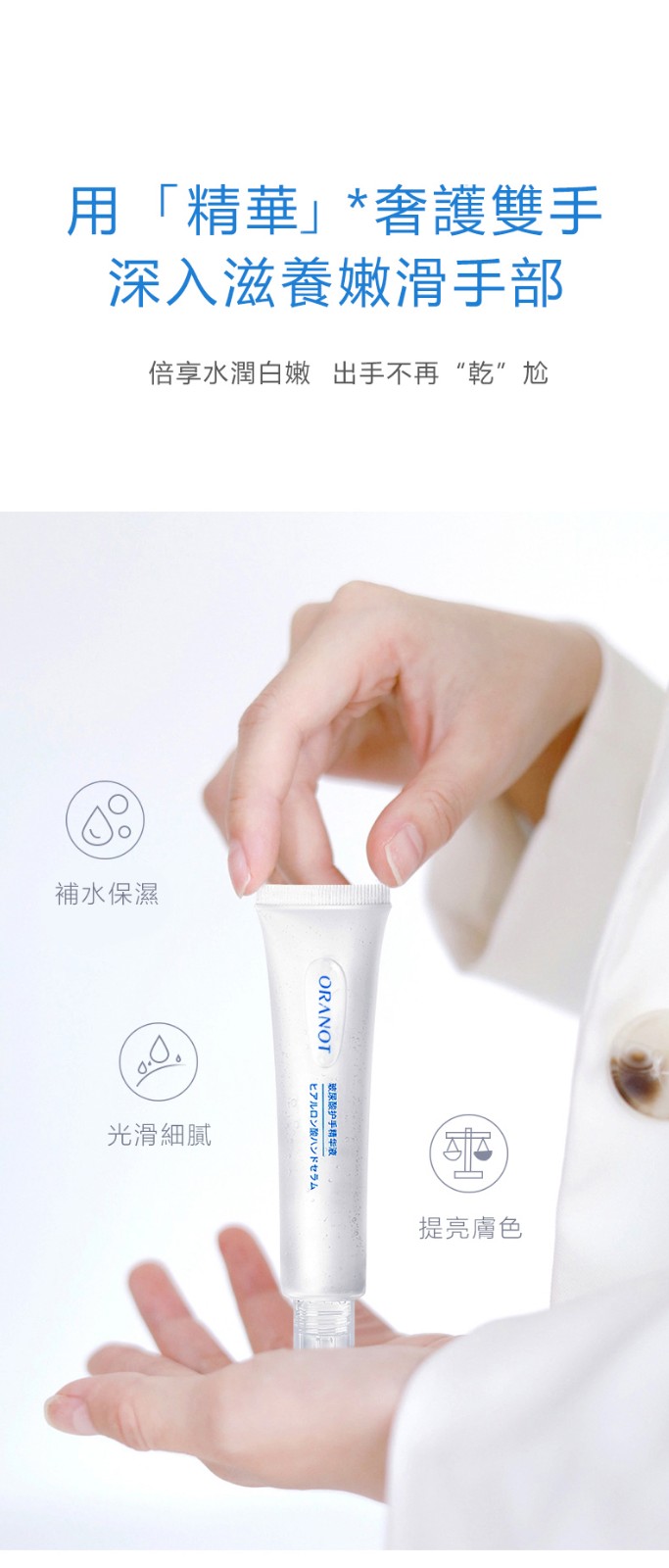 日本原裝ORANOT 玻尿酸護手精華液40ml 超水感玻尿酸保濕精華護手霜推薦,護手精華手霜手膜補水保濕清爽不油膩防乾燥, 玻尿酸護手精華液有清薄透明狀質地,不黏膩好推開.滴口設計,更好控制用量.高級的烟酰胺+玻尿酸,深層滲透改善肌膚。