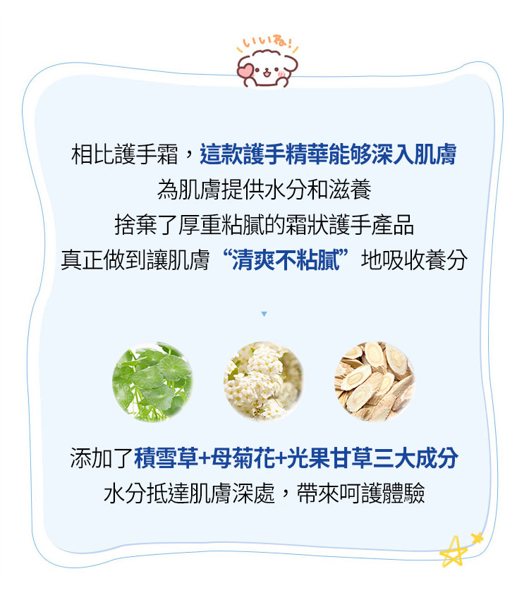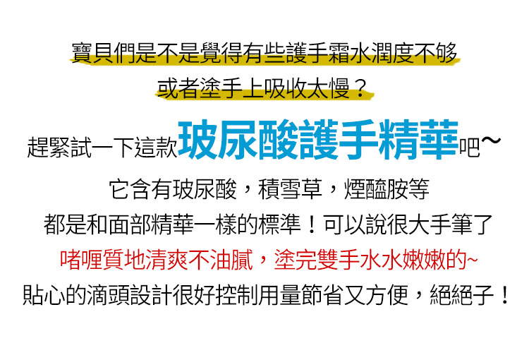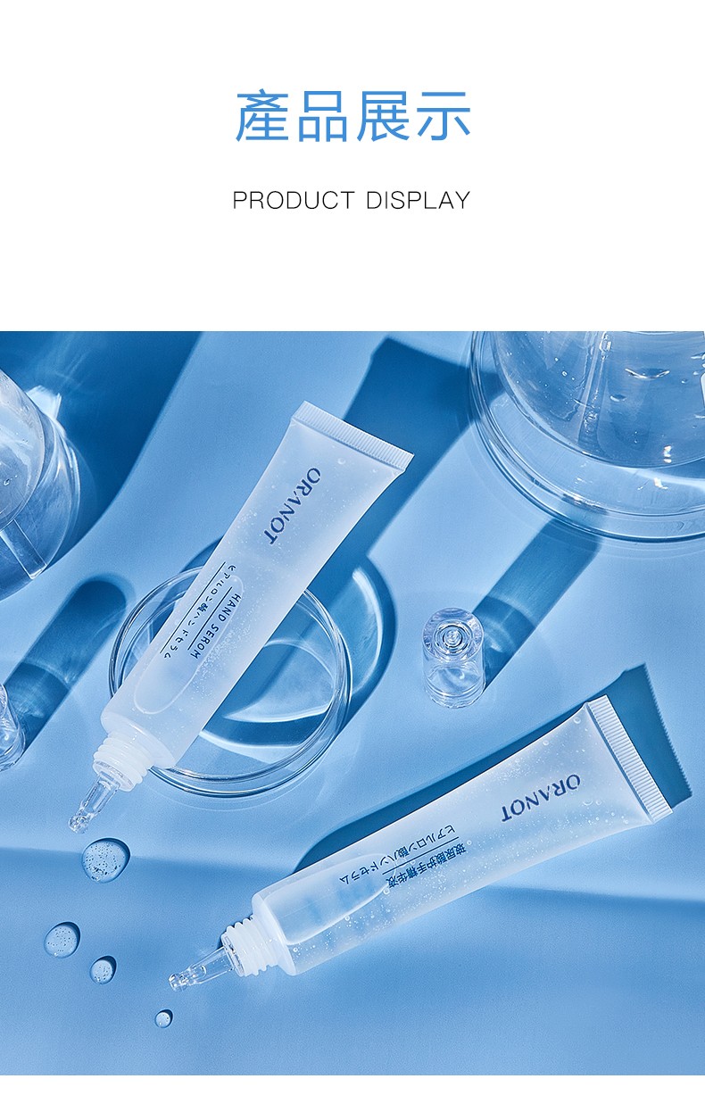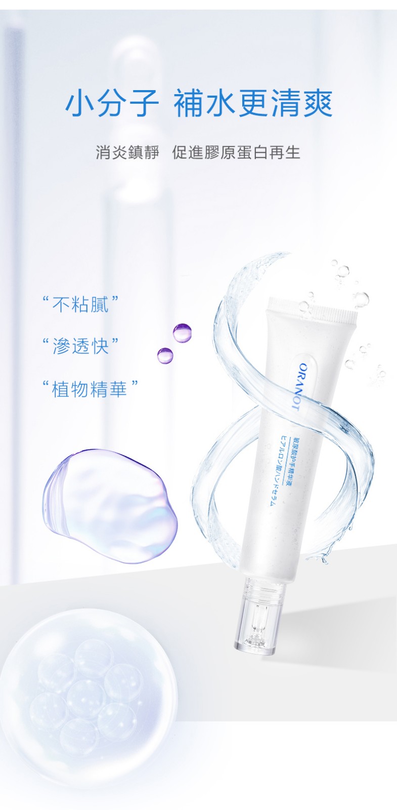 日本原裝ORANOT 玻尿酸護手精華液40ml 超水感玻尿酸保濕精華護手霜推薦,護手精華手霜手膜補水保濕清爽不油膩防乾燥, 玻尿酸護手精華液有清薄透明狀質地,不黏膩好推開.滴口設計,更好控制用量.高級的烟酰胺+玻尿酸,深層滲透改善肌膚。